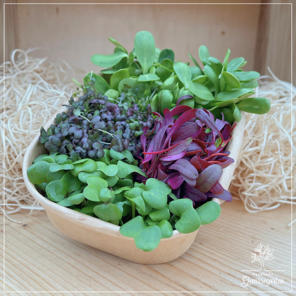 Schon gewusst? In Deinem Gemüsekörbchen bekommst Du alle 2 Wochen Microgreens zum Verfeinern Deines Gemüses dazu – immer im Wechsel mit unseren frischen Kräutern.